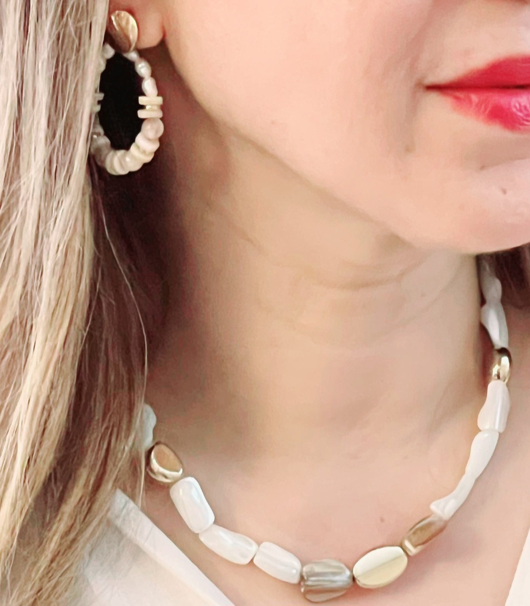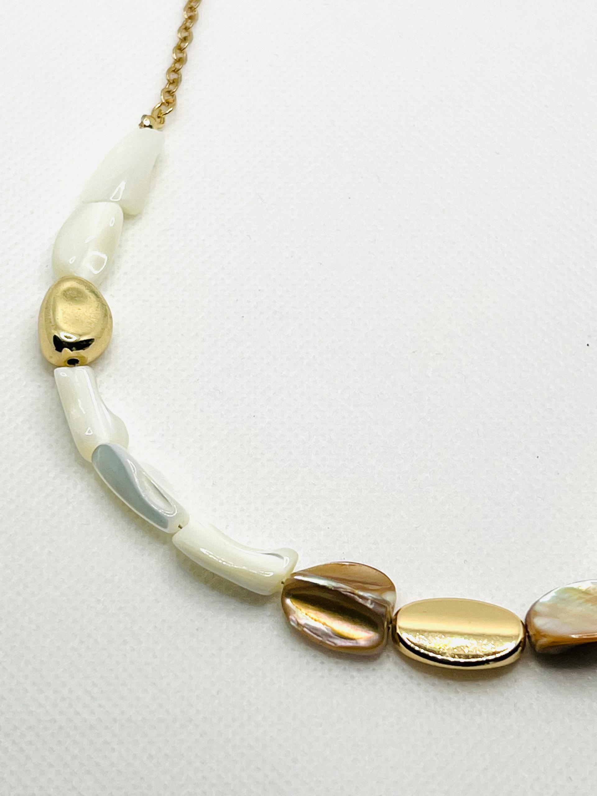 دستهبندی: اکسسوری زنانهجنس: سنگ وصدف و آبکاریرنگ: ترکیب طلایی وسفید وبژکشور تولید کننده: پرتغالسایز: حدود ۴۵ سانت